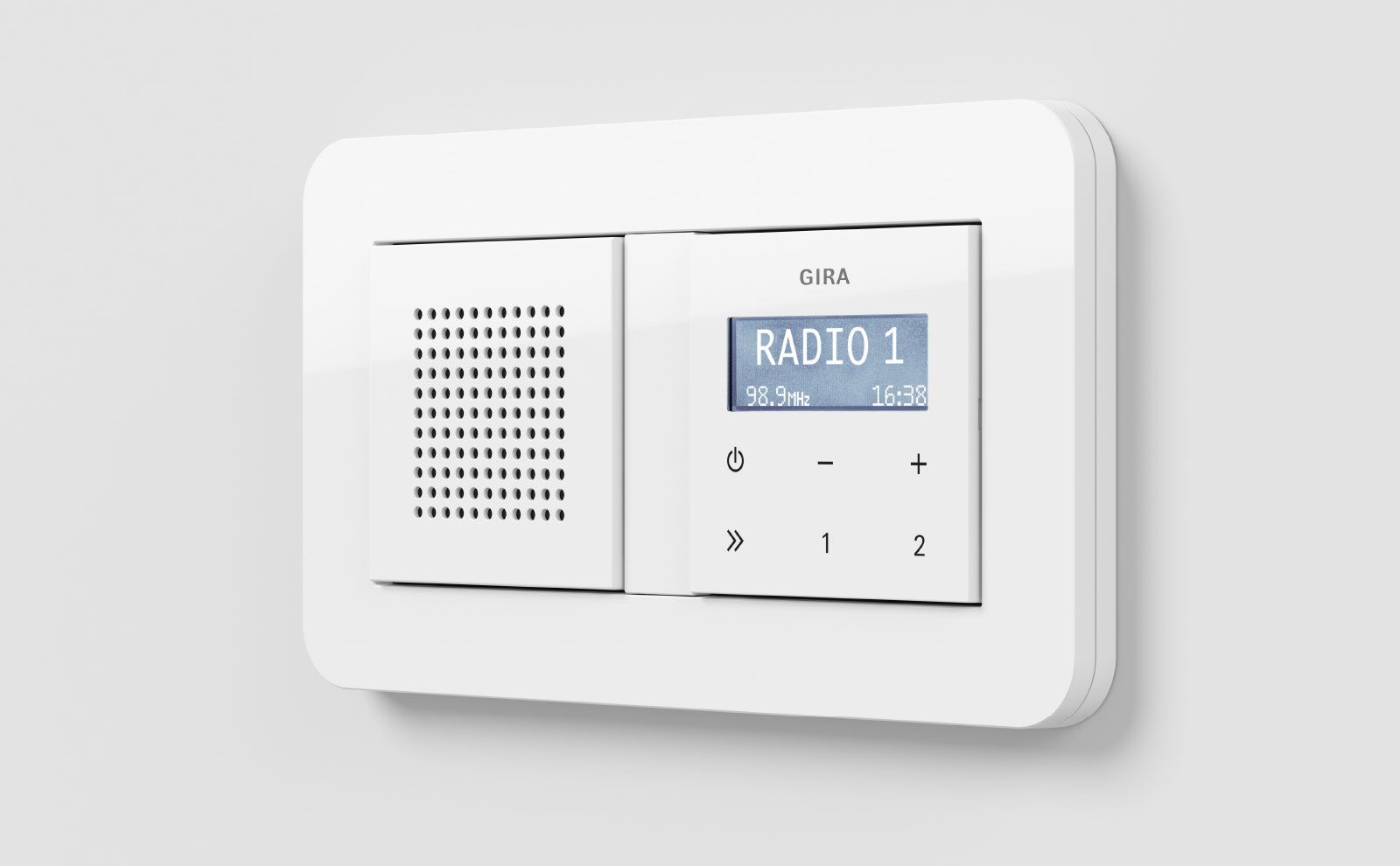 完全没有照明开关、插座,而是在墙上有一个节省空间的音响设施:凭借 Gira 收音机创新的扬声器系统,其通过人性化的显示屏提供了出色的音效和最大的操作舒适性。与 Gira 附加扬声器组合使用,还可以享受到拥有立体声音效的音乐节目。