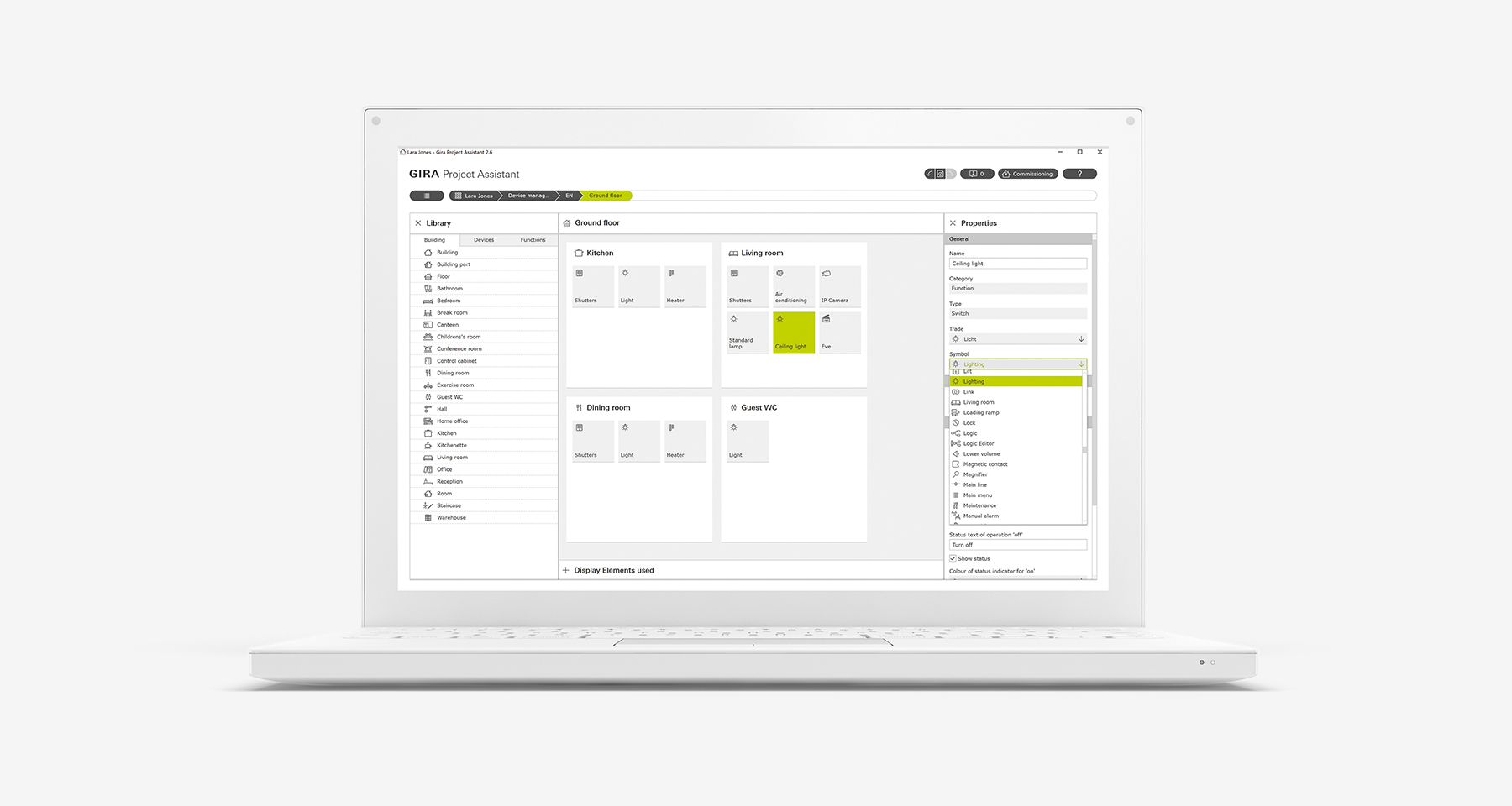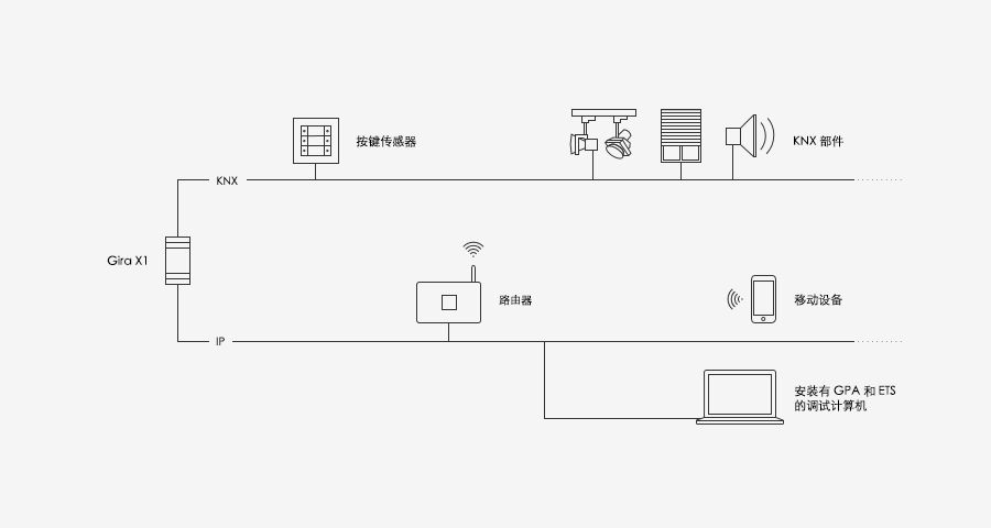 使用 Gira Project Assistant 可为 Gira X1 进行可视化参数设置,从而帮助您的专业电气工程师轻松调试 X1。利用 Gira X1 配置 KNX 设备时,可以方便直观地运用拖放功能完成。也可以使用 ETS 和 Gira X1 作为 KNX 接口来设置 KNX 设备参数。舒适、安全、节能:利用 Gira X1 可以快速简单地实现智能家居的诸多优势。