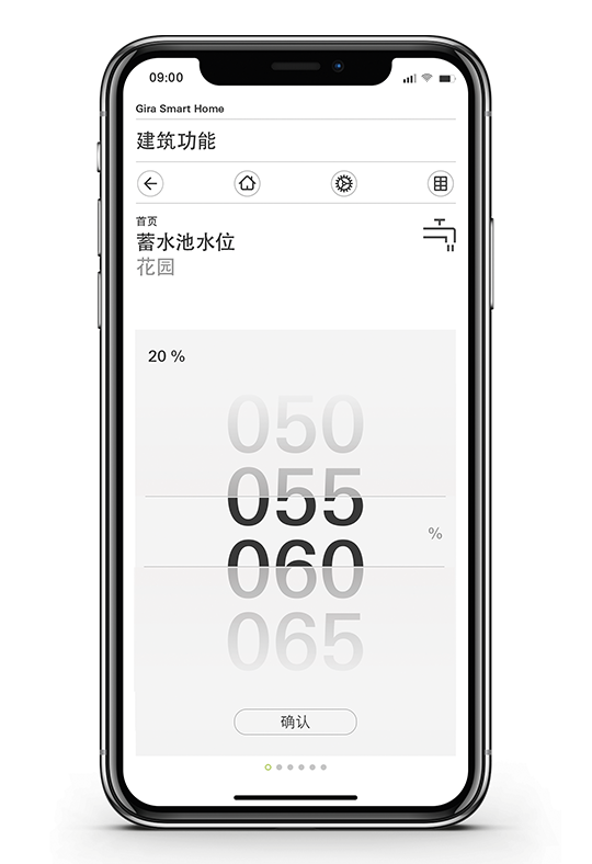 在 Gira 智能家居 App 中,建筑物内的所有功能均以瓷砖图标的形式显示。例如接通和关闭、调节温度或按固定分级调光等中央功能均可在此视图内进行操作。