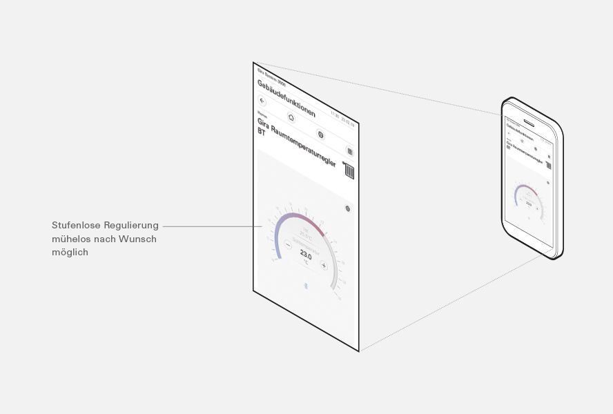 Gira System 3000 室温控制器内置供暖和制冷程序可确保合适的舒适温度。通过其时间编程,还能以智能方式,根据实际需要(例如住户不在家或较少使用的情况)控制各个房间的室温,从而节省成本和资源。室温可通过显示屏设备或 Bluetooth 面板,借助智能手机或平板电脑上的 App 进行控制。